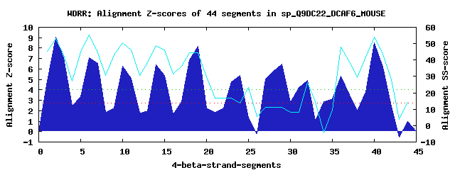 13 WD40-repeats found in QUERY=sp_Q9DC22_DCAF6_MOUSE (Len=876):(Red - Z-score>4.0)