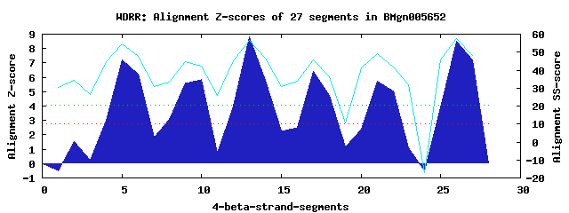 6 WD40-repeats found in QUERY=BMgn005652 (Len=447):(Red - Z-score>4.0)