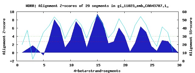 6 WD40-repeats found in QUERY=gi_11023_emb_CAA43707.1_ (Len=445):(Red - Z-score>4.0)