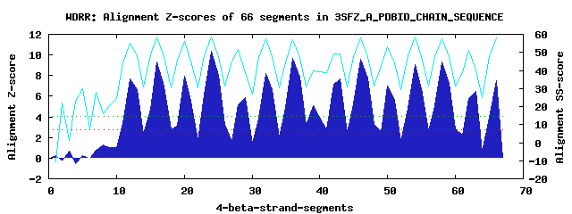 15 WD40-repeats found in QUERY=3SFZ_A_PDBID_CHAIN_SEQUENCE (Len=1249):(Red - Z-score>4.0)