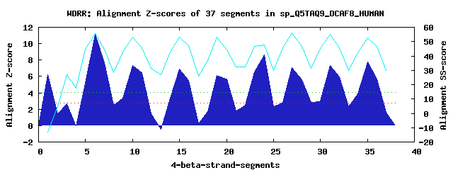 9 WD40-repeats found in QUERY=sp_Q5TAQ9_DCAF8_HUMAN (Len=597):(Red - Z-score>4.0)