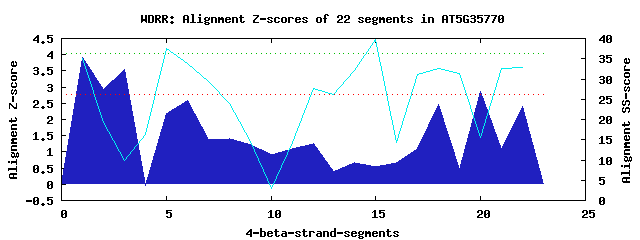 2 WD40-repeats found in QUERY=AT5G35770 (Len=446):(Red - Z-score>4.0)