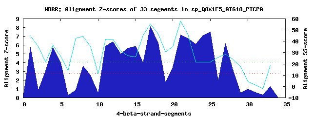 9 WD40-repeats found in QUERY=sp_Q8X1F5_ATG18_PICPA (Len=543):(Red - Z-score>4.0)